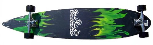 Krown Green Flame Pintail Longboard. The deck is 9" x 43" and has wheel cutouts to reduce wheel bites. This is a very popular shape, and manufactured by one of largest longboard makers. This is a pre-assembled complete. The components included are 6.0 Aluminum alloy trucks, with Abec 7 Bearings and 70mm Black Wheels. This complete sells for $99.99 most places.